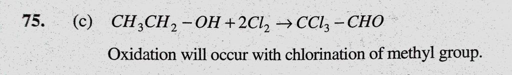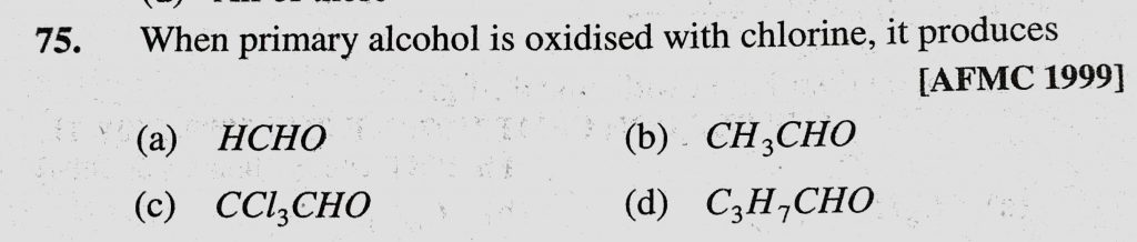 When primary alcohol is oxidised with chlorine, it produces (a) HCHO (b) CH3CHO (c) CCl3CHO (d) C3H7CHO it produces (a) HCHO (b) CH3CHO (c) CCl3CHO (d) C3H7CHO When primary alcohol is oxidised with chlorine February 11, 2021 Category: Uncategorised (JEE Advanced Physics by BM Sharma + GMP Solutions) , Facebook Messenger WhatsApp Share this:TwitterFacebook Related