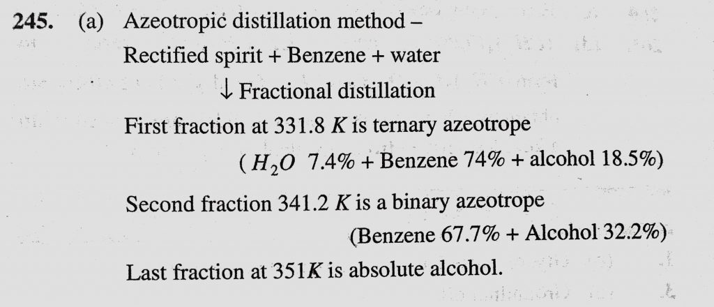 When rectified spirit and benzene are distilled together, the first fraction obtained is (a) A ternary azeotrope (b) Absolute alcohol (c) A binary azeotrope (d) Denatured spirit the first fraction obtained is (a) A ternary azeotrope (b) Absolute alcohol (c) A binary azeotrope (d) Denatured spirit When rectified spirit and benzene are distilled together February 11, 2021 Category: Uncategorised (JEE Advanced Physics by BM Sharma + GMP Solutions) , Facebook Messenger WhatsApp Share this:TwitterFacebook Related