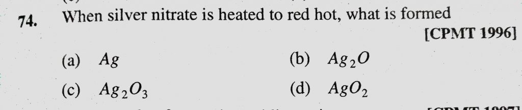 When silver nitrate is heated to red hot, what is formed (a) Ag (b) Ag2O (c) Ag2O3 (d) AgO2 what is formed (a) Ag (b) Ag2O (c) Ag2O3 (d) AgO2 When silver nitrate is heated to red hot December 1, 2020 Category: Uncategorised (JEE Advanced Physics by BM Sharma + GMP Solutions) , Facebook Messenger WhatsApp Share this:TwitterFacebook Related
