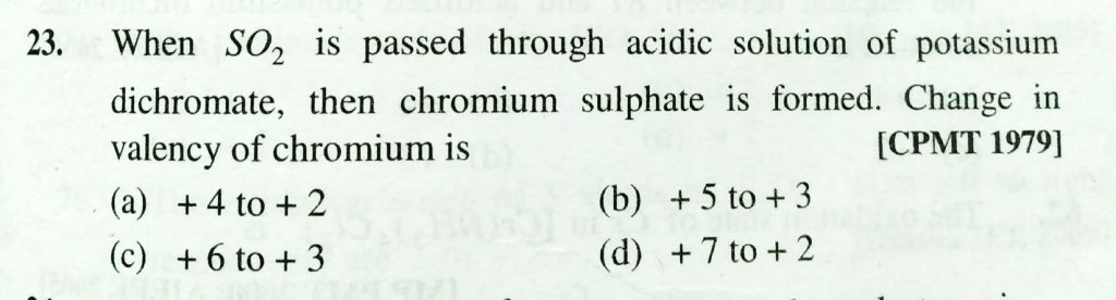 When SO2 is passed through acidic solution of potassium dichromate, then chromium sulphate is formed . Change in valency of chromium is then chromium sulphate is formed . Change in valency of chromium is When SO2 is passed through acidic solution of potassium dichromate November 23, 2020 Category: Uncategorised (JEE Advanced Physics by BM Sharma + GMP Solutions) , Facebook Messenger WhatsApp Share this:TwitterFacebook Related