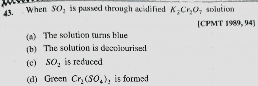When SO2 is passed through acidified K2Cr2O7 solution (a) The solution turns blue (b) The solution is decolourised When SO2 is passed through acidified K2Cr2O7 solution (a) The solution turns blue (b) The solution is decolourised November 23, 2020 Category: Uncategorised (JEE Advanced Physics by BM Sharma + GMP Solutions) , Facebook Messenger WhatsApp Share this:TwitterFacebook Related