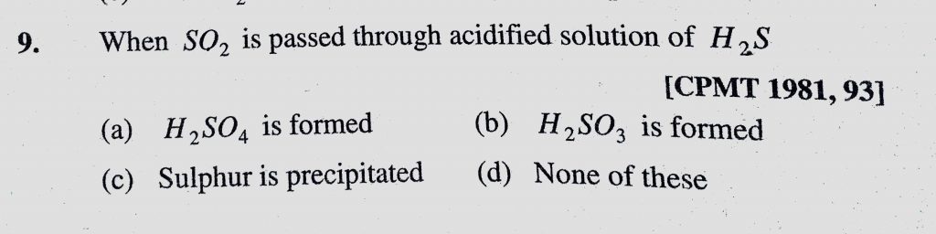 When SO2 is passed through acidified solution of H2S (a) H2SO4 is formed (b) H2SO3 is formed When SO2 is passed through acidified solution of H2S (a) H2SO4 is formed (b) H2SO3 is formed November 25, 2020 Category: Uncategorised (JEE Advanced Physics by BM Sharma + GMP Solutions) , Facebook Messenger WhatsApp Share this:TwitterFacebook Related