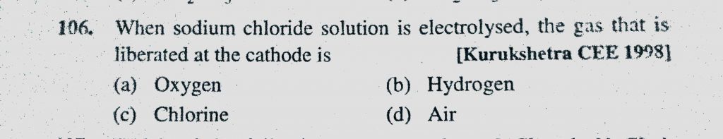 When sodium chloride solution is electrolysed, the gas that is liberated at the cathode is (a) Oxygen (b) Hydrogen (c) Chlorine the gas that is liberated at the cathode is (a) Oxygen (b) Hydrogen (c) Chlorine When sodium chloride solution is electrolysed November 15, 2020 Category: Uncategorised (JEE Advanced Physics by BM Sharma + GMP Solutions) , Facebook Messenger WhatsApp Share this:TwitterFacebook Related