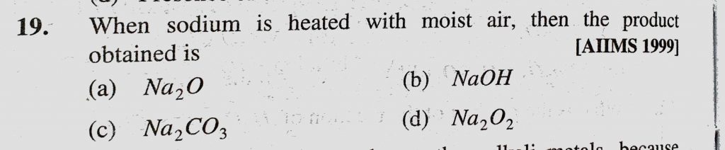 When sodium is heated with moist air, then the product obtained is (a) Na2O (b) NaOH (c) Na2CO3 (d) Na2O2 then the product obtained is (a) Na2O (b) NaOH (c) Na2CO3 (d) Na2O2 When sodium is heated with moist air November 13, 2020 Category: Uncategorised (JEE Advanced Physics by BM Sharma + GMP Solutions) , Facebook Messenger WhatsApp Share this:TwitterFacebook Related