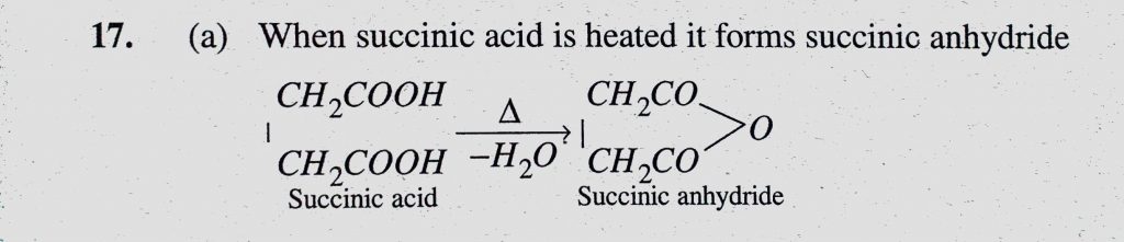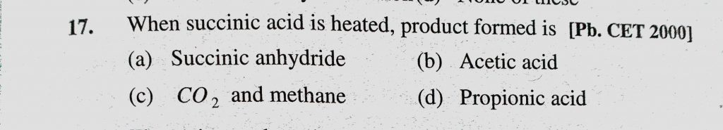 When succinic acid is heated, product formed is (a)Succinic anhydride (b) Acetic acid (c) CO2 and methane (d) Propionic acid product formed is (a)Succinic anhydride (b) Acetic acid (c) CO2 and methane (d) Propionic acid When succinic acid is heated February 13, 2021 Category: Uncategorised (JEE Advanced Physics by BM Sharma + GMP Solutions) , Facebook Messenger WhatsApp Share this:TwitterFacebook Related