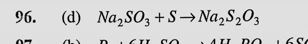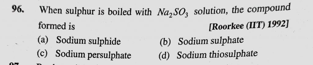 When sulphur is boiled with Na2SO3 solution, the compound formed is (a) Sodium sulphide (b) Sodium sulphate (c) Sodium persulphate the compound formed is (a) Sodium sulphide (b) Sodium sulphate (c) Sodium persulphate When sulphur is boiled with Na2SO3 solution November 27, 2020 Category: Uncategorised (JEE Advanced Physics by BM Sharma + GMP Solutions) , Facebook Messenger WhatsApp Share this:TwitterFacebook Related