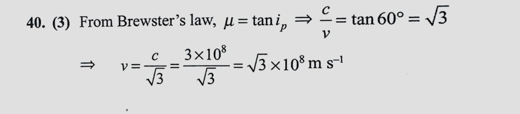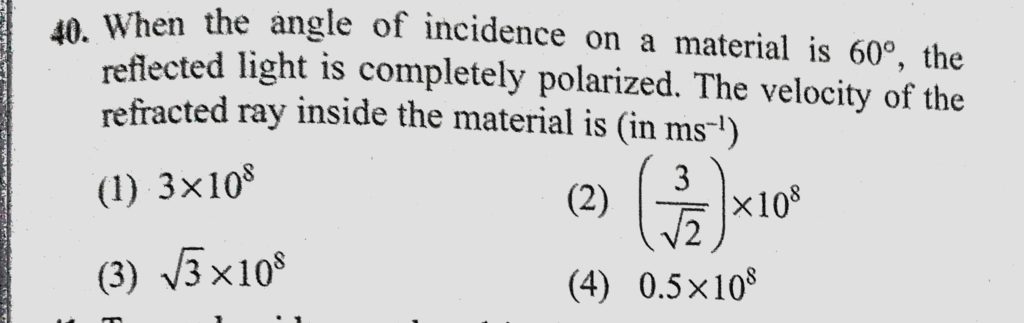 When the angle of incidence on a material is 60, the reflected light is completely polarized. The velocity of the refracted ray inside the material is (in m/s) the reflected light is completely polarized. The velocity of the refracted ray inside the material is (in m/s) When the angle of incidence on a material is 60 October 12, 2020 Category: Uncategorised (JEE Advanced Physics by BM Sharma + GMP Solutions) , Facebook Messenger WhatsApp Share this:TwitterFacebook Related