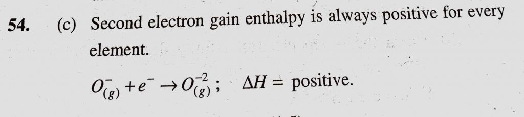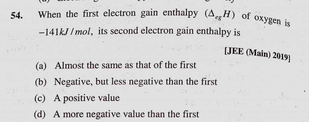 When the first electron gain enthalpy (delta eg H) of oxygen is -141 kJ/mol, its second electron gain enthalpy is (a) Almost the same as that of the first (b) Negative, but less negative but less negative its second electron gain enthalpy is (a) Almost the same as that of the first (b) Negative When the first electron gain enthalpy (delta eg H) of oxygen is -141 kJ/mol November 11, 2020 Category: Uncategorised (JEE Advanced Physics by BM Sharma + GMP Solutions) , Facebook Messenger WhatsApp Share this:TwitterFacebook Related