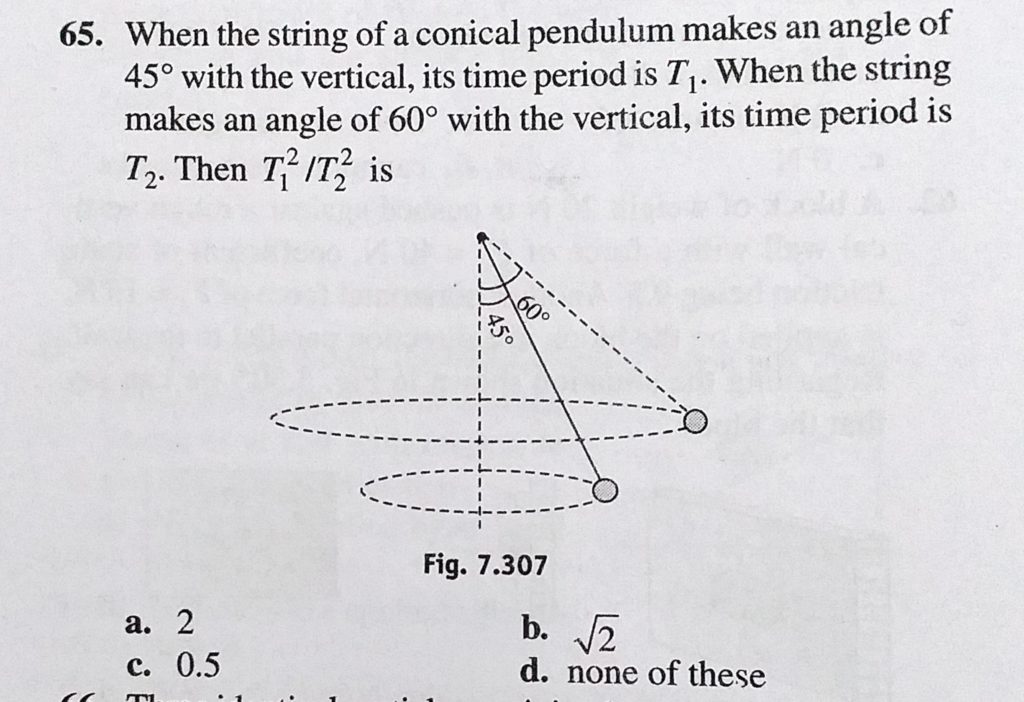 When the string of a conical pendulum makes an angle of 45 with the vertical, its time period is T1. When the string makes an angle of 60 with the vertical, its time period is T2. its time period is T1. When the string makes an angle of 60 with the vertical its time period is T2. When the string of a conical pendulum makes an angle of 45 with the vertical October 1, 2020 Category: Uncategorised (JEE Advanced Physics by BM Sharma + GMP Solutions) , Facebook Messenger WhatsApp Share this:TwitterFacebook Related