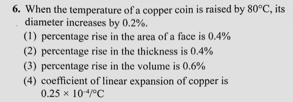When the temperature of a copper coin is raised by 80 C, its diameter increases by 0.2 % its diameter increases by 0.2 % When the temperature of a copper coin is raised by 80 C October 24, 2020 Category: Uncategorised (JEE Advanced Physics by BM Sharma + GMP Solutions) , Facebook Messenger WhatsApp Share this:TwitterFacebook Related