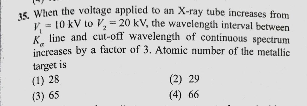 when the voltage applied to an X-ray tube increases from V1 = 10 KV to V2 = 20 kV, the wavelength interval between K alpha line and cut-off wavelength of continuous spectrum increases the wavelength interval between K alpha line and cut-off wavelength of continuous spectrum increases when the voltage applied to an X-ray tube increases from V1 = 10 KV to V2 = 20 kV October 15, 2020 Category: Uncategorised (JEE Advanced Physics by BM Sharma + GMP Solutions) , Facebook Messenger WhatsApp Share this:TwitterFacebook Related