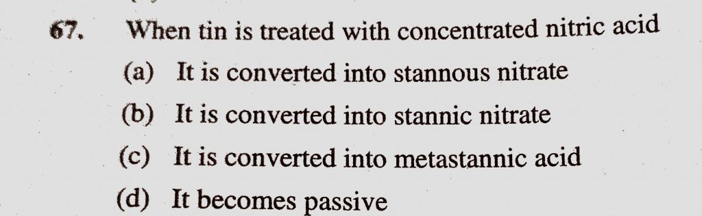 When tin is treated with concentrated nitric acid (a) It is converted into stannous nitrate (b) It is converted into stannic nitrate (c) It is converted into metastannic acid When tin is treated with concentrated nitric acid (a) It is converted into stannous nitrate (b) It is converted into stannic nitrate (c) It is converted into metastannic acid November 17, 2020 Category: Uncategorised (JEE Advanced Physics by BM Sharma + GMP Solutions) , Facebook Messenger WhatsApp Share this:TwitterFacebook Related