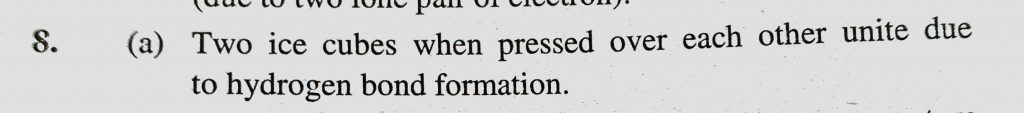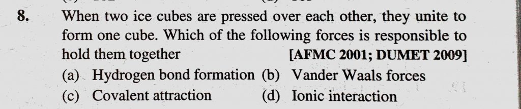 When two ice cubes are pressed over each other, they unite to form one cube. Which of the following forces is responsible to hold them together (a) Hydrogen bond formation they unite to form one cube. Which of the following forces is responsible to hold them together (a) Hydrogen bond formation When two ice cubes are pressed over each other November 13, 2020 Category: Uncategorised (JEE Advanced Physics by BM Sharma + GMP Solutions) , Facebook Messenger WhatsApp Share this:TwitterFacebook Related