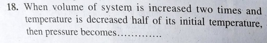 When volume of system is increased two times and temperature is decreased half of its initial temperature, then pressure becomes……….. then pressure becomes........... When volume of system is increased two times and temperature is decreased half of its initial temperature October 4, 2020 Category: Uncategorised (JEE Advanced Physics by BM Sharma + GMP Solutions) , Facebook Messenger WhatsApp Share this:TwitterFacebook Related