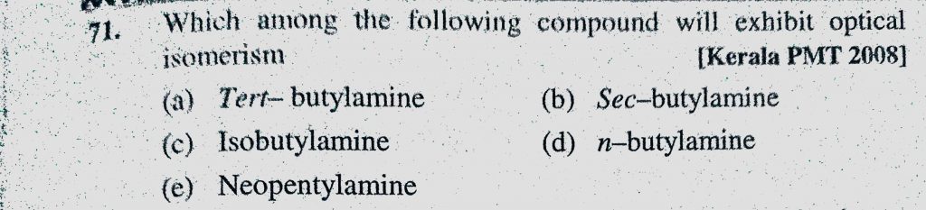 Which among the following compound will exhibit optical isomerism (a) Tert-butylamine (b) sec-butylamine Which among the following compound will exhibit optical isomerism (a) Tert-butylamine (b) sec-butylamine December 10, 2020 Category: Uncategorised (JEE Advanced Physics by BM Sharma + GMP Solutions) , Facebook Messenger WhatsApp Share this:TwitterFacebook Related