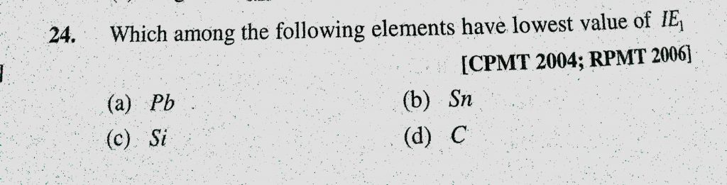 Which among the following elements have lowest value of IE1 (a) Pb (b) Sn (c) Si (d) C Which among the following elements have lowest value of IE1 (a) Pb (b) Sn (c) Si (d) C November 9, 2020 Category: Uncategorised (JEE Advanced Physics by BM Sharma + GMP Solutions) , Facebook Messenger WhatsApp Share this:TwitterFacebook Related