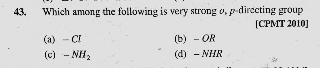Which among the following is very strong o, p-directing group (a) -Cl (b) -OR (c) -NH2 (d) -NHR p-directing group (a) -Cl (b) -OR (c) -NH2 (d) -NHR Which among the following is very strong o December 15, 2020 Category: Uncategorised (JEE Advanced Physics by BM Sharma + GMP Solutions) , Facebook Messenger WhatsApp Share this:TwitterFacebook Related