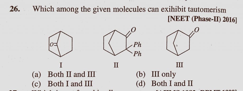 Which among the given molecules can exhibit tautomerism (a) Both II and III (b) III only (c) Both I and III Which among the given molecules can exhibit tautomerism (a) Both II and III (b) III only (c) Both I and III December 10, 2020 Category: Uncategorised (JEE Advanced Physics by BM Sharma + GMP Solutions) , Facebook Messenger WhatsApp Share this:TwitterFacebook Related