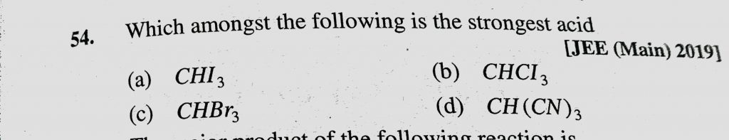 Which amongst the following is the strongest acid (a) CHI3 (b) CHCI3 (c) CHBr3 (d) CH(CN)3 Which amongst the following is the strongest acid (a) CHI3 (b) CHCI3 (c) CHBr3 (d) CH(CN)3 February 9, 2021 Category: Uncategorised (JEE Advanced Physics by BM Sharma + GMP Solutions) , Facebook Messenger WhatsApp Share this:TwitterFacebook Related