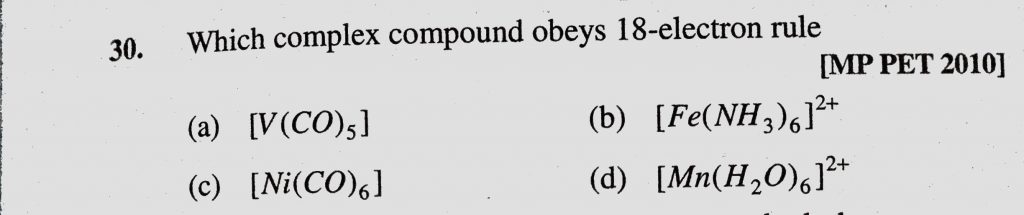 Which complex compound obeys 18 electron rule (a) (V(CO)5) (b) (Fe(NH3)6) 2+ (c) (Ni(CO)6) Which complex compound obeys 18 electron rule (a) (V(CO)5) (b) (Fe(NH3)6) 2+ (c) (Ni(CO)6) December 4, 2020 Category: Uncategorised (JEE Advanced Physics by BM Sharma + GMP Solutions) , Facebook Messenger WhatsApp Share this:TwitterFacebook Related