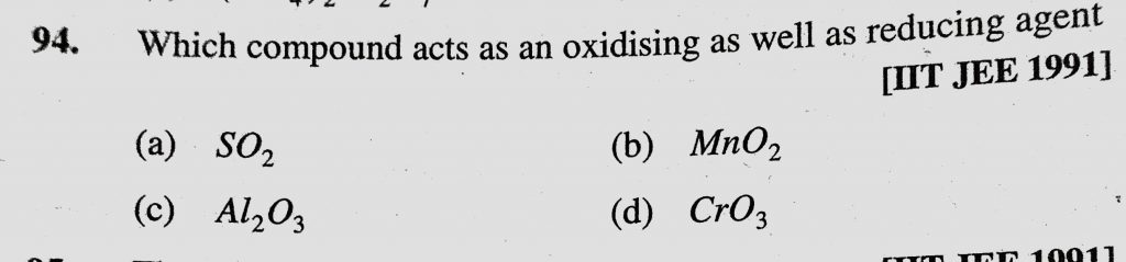 Which compound acts as an oxidising as well as reducing agent (a) SO2 (b) MnO2 (c) Al2O3 (d) CrO3 Which compound acts as an oxidising as well as reducing agent (a) SO2 (b) MnO2 (c) Al2O3 (d) CrO3 November 27, 2020 Category: Uncategorised (JEE Advanced Physics by BM Sharma + GMP Solutions) , Facebook Messenger WhatsApp Share this:TwitterFacebook Related
