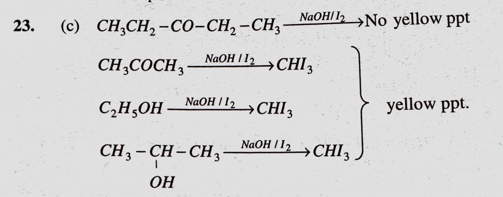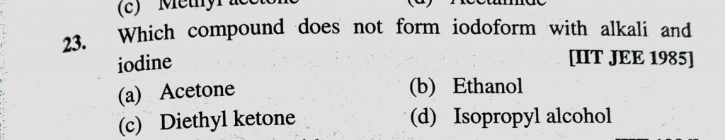Which compound does not form iodoform with alkali and iodine (a) Acetone (b) Ethanol (c) Diethyl ketone (d) Isopropyl alcohol Which compound does not form iodoform with alkali and iodine (a) Acetone (b) Ethanol (c) Diethyl ketone (d) Isopropyl alcohol February 9, 2021 Category: Uncategorised (JEE Advanced Physics by BM Sharma + GMP Solutions) , Facebook Messenger WhatsApp Share this:TwitterFacebook Related