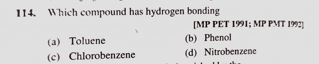 Which compound has hydrogen bonding (a) Toluene (b) Phenol (c) Chlorobenzene (d) Nitrobenzene Which compound has hydrogen bonding (a) Toluene (b) Phenol (c) Chlorobenzene (d) Nitrobenzene February 14, 2021 Category: Uncategorised (JEE Advanced Physics by BM Sharma + GMP Solutions) , Facebook Messenger WhatsApp Share this:TwitterFacebook Related