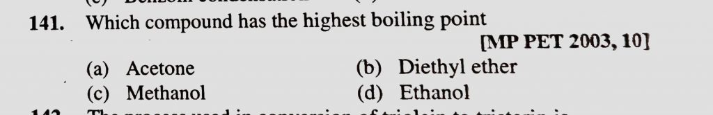 Which compound has the highest boiling point (a) Acetone (b) Diethyl ether (c) Methanol (d) Ethanol Which compound has the highest boiling point (a) Acetone (b) Diethyl ether (c) Methanol (d) Ethanol February 14, 2021 Category: Uncategorised (JEE Advanced Physics by BM Sharma + GMP Solutions) , Facebook Messenger WhatsApp Share this:TwitterFacebook Related