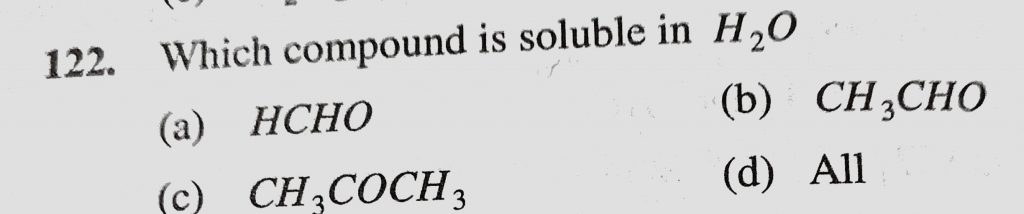 Which compound is soluble in H2O (a) HCHO (b) CH3CHO (c) CH3COCH3 (d) All Which compound is soluble in H2O (a) HCHO (b) CH3CHO (c) CH3COCH3 (d) All February 12, 2021 Category: Uncategorised (JEE Advanced Physics by BM Sharma + GMP Solutions) , Facebook Messenger WhatsApp Share this:TwitterFacebook Related