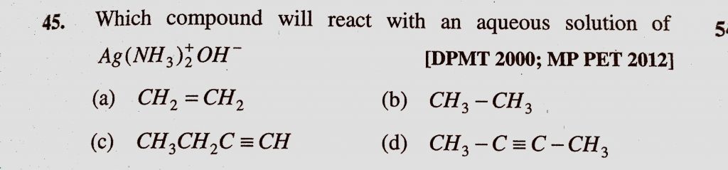 Which compound will react with an aqueous solution of Ag(NH3)2+OH- (a) CH2 = CH2 (b) CH3 – CH3 (c) CH3CH2C Which compound will react with an aqueous solution of Ag(NH3)2+OH- (a) CH2 = CH2 (b) CH3 - CH3 (c) CH3CH2C December 14, 2020 Category: Uncategorised (JEE Advanced Physics by BM Sharma + GMP Solutions) , Facebook Messenger WhatsApp Share this:TwitterFacebook Related