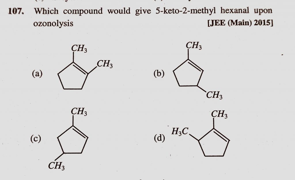 Which compound would give 5-keto-2-methyl hexanal upon ozonolysis Which compound would give 5-keto-2-methyl hexanal upon ozonolysis December 16, 2020 Category: Uncategorised (JEE Advanced Physics by BM Sharma + GMP Solutions) , Facebook Messenger WhatsApp Share this:TwitterFacebook Related
