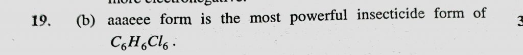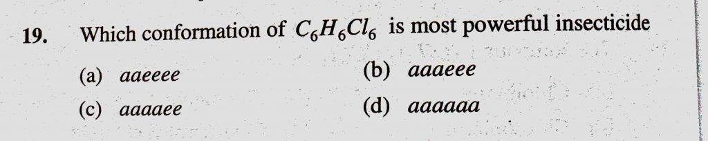 Which conformation of C6H6Cl6 is most powerful insecticide (a) aaeee (b) aaaeee (c) aaaaee (d) aaaaaa Which conformation of C6H6Cl6 is most powerful insecticide (a) aaeee (b) aaaeee (c) aaaaee (d) aaaaaa February 9, 2021 Category: Uncategorised (JEE Advanced Physics by BM Sharma + GMP Solutions) , Facebook Messenger WhatsApp Share this:TwitterFacebook Related