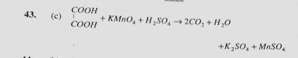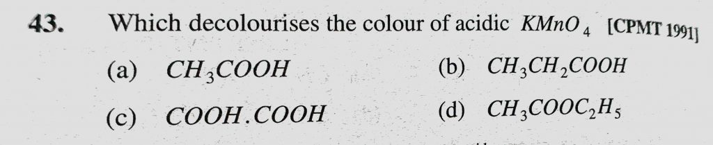 Which decolourises the colour of acidic KMnO4 (a) CH3COOH (b) CH3CH2COOH (c) COOH.COOH (d) CH3COOC2H5 Which decolourises the colour of acidic KMnO4 (a) CH3COOH (b) CH3CH2COOH (c) COOH.COOH (d) CH3COOC2H5 February 13, 2021 Category: Uncategorised (JEE Advanced Physics by BM Sharma + GMP Solutions) , Facebook Messenger WhatsApp Share this:TwitterFacebook Related