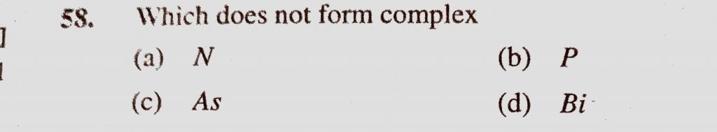 Which does not form complex (a) N (b) P (c) As (d) Bi Which does not form complex (a) N (b) P (c) As (d) Bi November 18, 2020 Category: Uncategorised (JEE Advanced Physics by BM Sharma + GMP Solutions) , Facebook Messenger WhatsApp Share this:TwitterFacebook Related