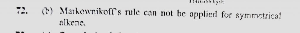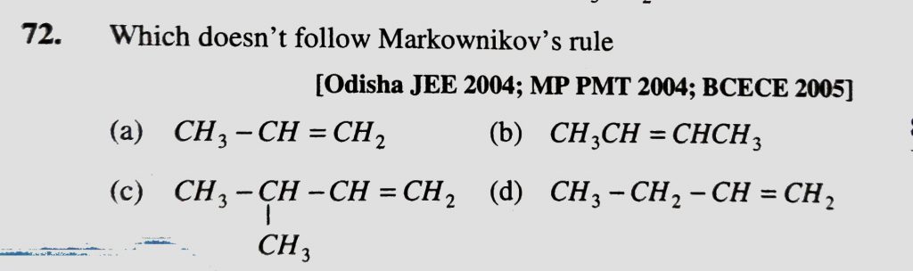 Which doesn’t follow Markownikov’s rule (a) CH3-CH=CH2 (b) CH3CH = CHCH3 (c) CH3-CH-CH = CH2 (d) CH3-CH2-CH=CH2 Which doesn't follow Markownikov's rule (a) CH3-CH=CH2 (b) CH3CH = CHCH3 (c) CH3-CH-CH = CH2 (d) CH3-CH2-CH=CH2 December 13, 2020 Category: Uncategorised (JEE Advanced Physics by BM Sharma + GMP Solutions) , Facebook Messenger WhatsApp Share this:TwitterFacebook Related