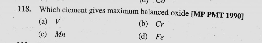 Which element gives maximum balanced oxide (a) V (b) Cr (c) Mn (d) Fe Which element gives maximum balanced oxide (a) V (b) Cr (c) Mn (d) Fe November 30, 2020 Category: Uncategorised (JEE Advanced Physics by BM Sharma + GMP Solutions) , Facebook Messenger WhatsApp Share this:TwitterFacebook Related
