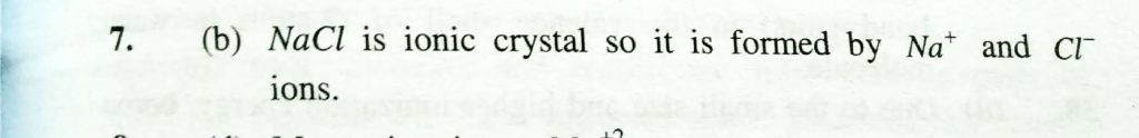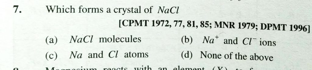 Which forms a crystal of NaCl (a) NaCl molecules (b) Na^+ and Cl^- ions (c) Na and Cl atoms (d) None of the above Which forms a crystal of NaCl (a) NaCl molecules (b) Na^+ and Cl^- ions (c) Na and Cl atoms (d) None of the above December 1, 2020 Category: Uncategorised (JEE Advanced Physics by BM Sharma + GMP Solutions) , Facebook Messenger WhatsApp Share this:TwitterFacebook Related