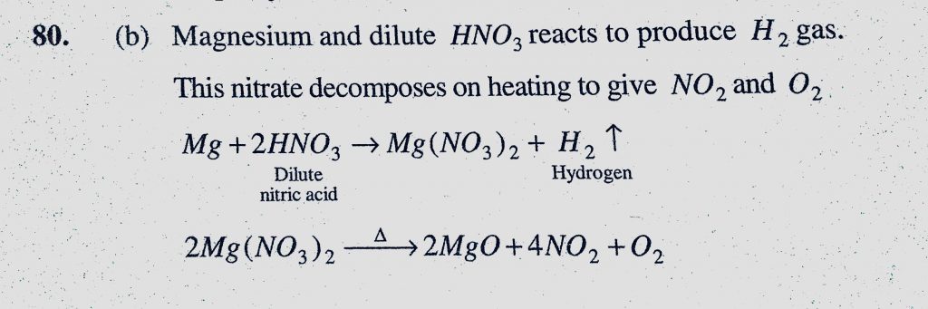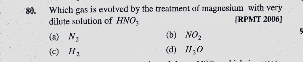 Which gas is evolved by the treatment of magnesium with very dilute solution of HNO3 (a) N2 (b) NO2 (c) H2 (d) H2O Which gas is evolved by the treatment of magnesium with very dilute solution of HNO3 (a) N2 (b) NO2 (c) H2 (d) H2O November 15, 2020 Category: Uncategorised (JEE Advanced Physics by BM Sharma + GMP Solutions) , Facebook Messenger WhatsApp Share this:TwitterFacebook Related