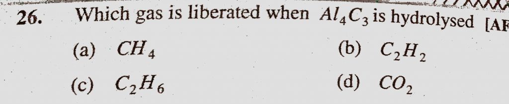 Which gas is liberated when Al4C3 is hydrolysed (a) CH4 (b) C2H2 (c) C2H6 (d) CO2 Which gas is liberated when Al4C3 is hydrolysed (a) CH4 (b) C2H2 (c) C2H6 (d) CO2 November 17, 2020 Category: Uncategorised (JEE Advanced Physics by BM Sharma + GMP Solutions) , Facebook Messenger WhatsApp Share this:TwitterFacebook Related