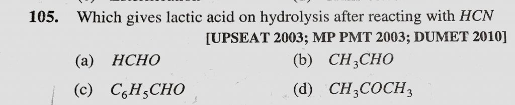 Which gives lactic acid on hydrolysis after reacting with HCN (a) HCHO (b) CH3CHO (c) C6H5CHO (d) CH3COCH3 Which gives lactic acid on hydrolysis after reacting with HCN (a) HCHO (b) CH3CHO (c) C6H5CHO (d) CH3COCH3 February 12, 2021 Category: Uncategorised (JEE Advanced Physics by BM Sharma + GMP Solutions) , Facebook Messenger WhatsApp Share this:TwitterFacebook Related