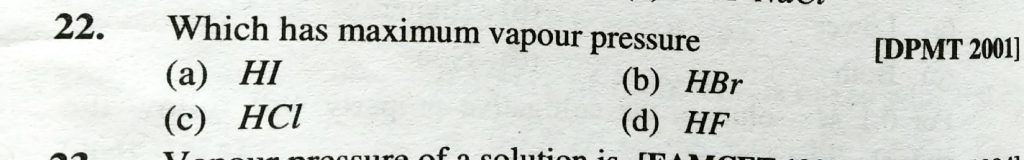 Which has maximum vapour pressure (a) HI (b) HBr (c) HCL (d) HF Which has maximum vapour pressure (a) HI (b) HBr (c) HCL (d) HF December 12, 2020 Category: Uncategorised (JEE Advanced Physics by BM Sharma + GMP Solutions) , Facebook Messenger WhatsApp Share this:TwitterFacebook Related