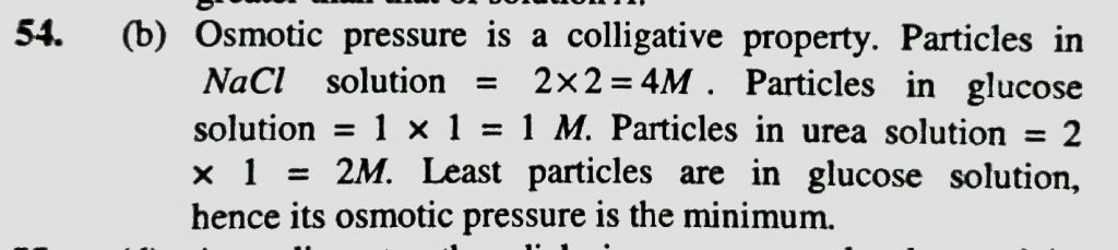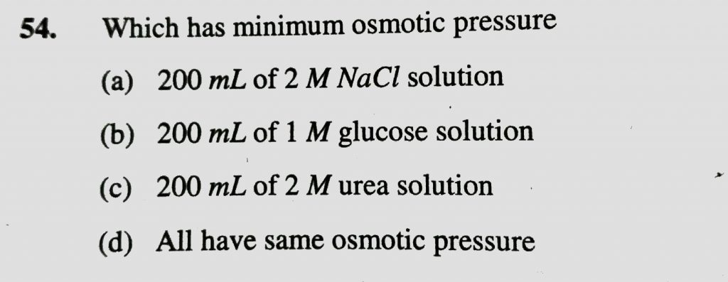 Which has minimum osmotic pressure (a) 200 ml of 2 M NaCL solution (b) 200 ml of 1 M glucose solution (c) 200 ml of 2 M ures solution (d) all have same osmotic pressure Which has minimum osmotic pressure (a) 200 ml of 2 M NaCL solution (b) 200 ml of 1 M glucose solution (c) 200 ml of 2 M ures solution (d) all have same osmotic pressure December 13, 2020 Category: Uncategorised (JEE Advanced Physics by BM Sharma + GMP Solutions) , Facebook Messenger WhatsApp Share this:TwitterFacebook Related