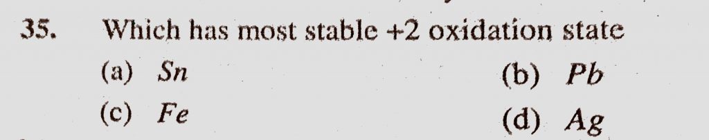 Which has most stable +2 oxidation state (a) Sn (b) Pb (c) Fe (d) Ag Which has most stable +2 oxidation state (a) Sn (b) Pb (c) Fe (d) Ag November 10, 2020 Category: Uncategorised (JEE Advanced Physics by BM Sharma + GMP Solutions) , Facebook Messenger WhatsApp Share this:TwitterFacebook Related