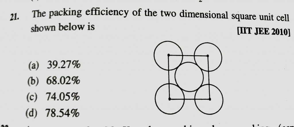 The packing effiency of the two dimensional square unit cell shown below is (a) 39.27% (b) 68.02% (c) 74.05% (d) 78.54 % The packing effiency of the two dimensional square unit cell shown below is (a) 39.27% (b) 68.02% (c) 74.05% (d) 78.54 % December 17, 2020 Category: Uncategorised (JEE Advanced Physics by BM Sharma + GMP Solutions) , Facebook Messenger WhatsApp Share this:TwitterFacebook Related