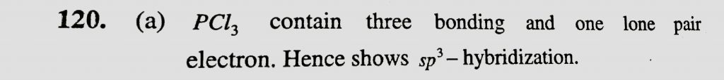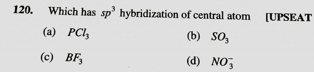 Which has sp^3 hybridization of central atom (a) PCL3 (b) SO3 (c) BF3 (d) NO3^- Which has sp^3 hybridization of central atom (a) PCL3 (b) SO3 (c) BF3 (d) NO3^- December 7, 2020 Category: Uncategorised (JEE Advanced Physics by BM Sharma + GMP Solutions) , Facebook Messenger WhatsApp Share this:TwitterFacebook Related