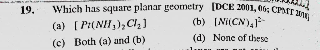 Which has square planar geometry (a) (Pt(NH3)2Cl2) (b) (Ni(CN)4)2- (c) Both (a) and (b) Which has square planar geometry (a) (Pt(NH3)2Cl2) (b) (Ni(CN)4)2- (c) Both (a) and (b) December 4, 2020 Category: Uncategorised (JEE Advanced Physics by BM Sharma + GMP Solutions) , Facebook Messenger WhatsApp Share this:TwitterFacebook Related