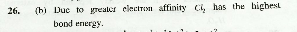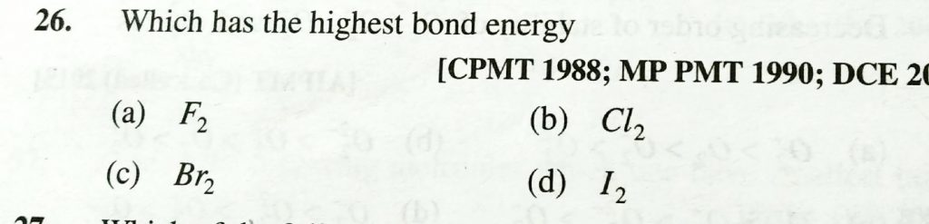 Which has the highest bond energy (a) F2 (b) CL2 (c) Br2 (d) I2 Which has the highest bond energy (a) F2 (b) CL2 (c) Br2 (d) I2 December 8, 2020 Category: Uncategorised (JEE Advanced Physics by BM Sharma + GMP Solutions) , Facebook Messenger WhatsApp Share this:TwitterFacebook Related