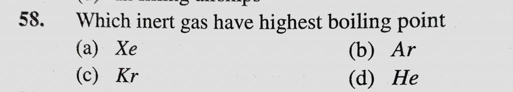 Which inert gas have highest boiling point (a) Xe (b) Ar (c) Kr (d) He Which inert gas have highest boiling point (a) Xe (b) Ar (c) Kr (d) He November 25, 2020 Category: Uncategorised (JEE Advanced Physics by BM Sharma + GMP Solutions) , Facebook Messenger WhatsApp Share this:TwitterFacebook Related