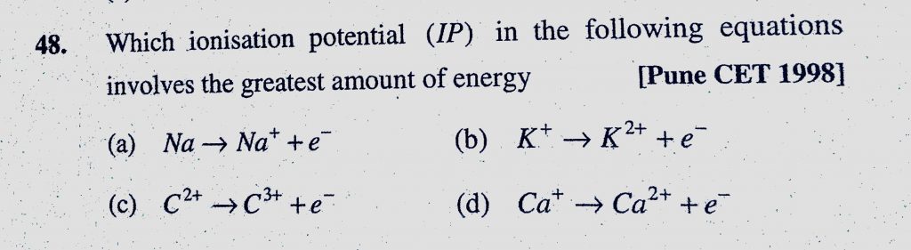 Which ionisation potential (IP) in the following equations involves the greatest amount of energy (a) Na to Na+ + e- Which ionisation potential (IP) in the following equations involves the greatest amount of energy (a) Na to Na+ + e- November 9, 2020 Category: Uncategorised (JEE Advanced Physics by BM Sharma + GMP Solutions) , Facebook Messenger WhatsApp Share this:TwitterFacebook Related