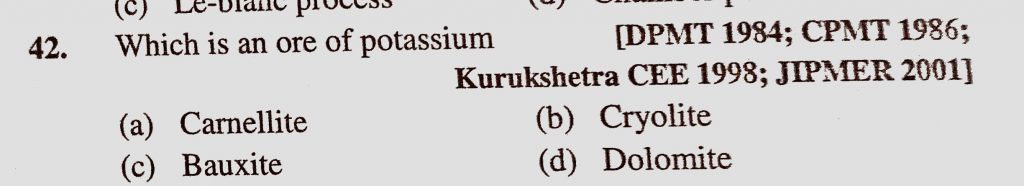 Which is an ore of potassium (a) Carnellite (b) Cryolite (c) Bauxite (d) Dolomite Which is an ore of potassium (a) Carnellite (b) Cryolite (c) Bauxite (d) Dolomite November 13, 2020 Category: Uncategorised (JEE Advanced Physics by BM Sharma + GMP Solutions) , Facebook Messenger WhatsApp Share this:TwitterFacebook Related